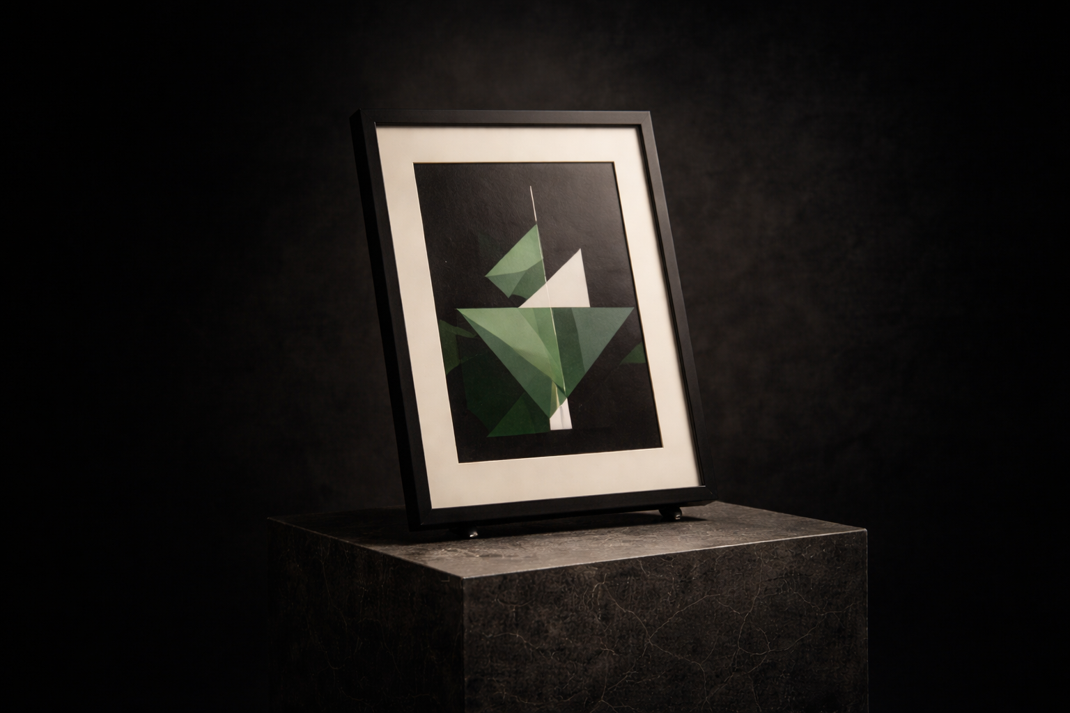 A limited edition geometric print with deep tones and emerald accents. Final outcome is private — only buyer and seller see the agreed result.